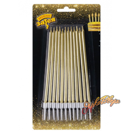 Украшение праздничного стола - металлизированные золотые свечи. Отличное решение для декорирования торта, десерта ко Дню рождения, Романтическому ужину, Свадьбе, Юбилею, Новому году. Высота свечи 13см, диаметр - 0,5см, в упаковке 12 штук с подставками.