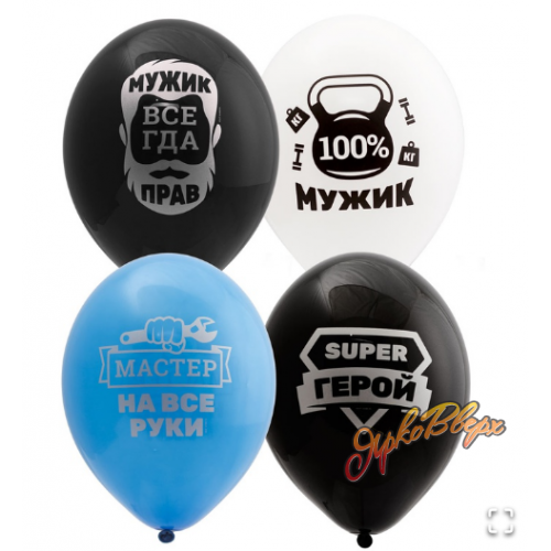 Высококачественный шар из натурального латекса. В упаковке 50 штук. Ассорти из трех цветов, одного типа - пастель - матовый оттенок цвета. Шары с двусторонним шелкографическими рисунком - надписями: Мужик всегда прав! Мастер на все руки. Зверь. Super герой. Суровый мужик. 100% мужик. Идеальный ассортимент для розничной продажи воздушных шариков и украшения праздника.