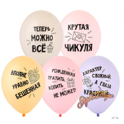 Высококачественный шар из натурального латекса. Ассорти из пяти цветов, одного типа - пастель - матовый оттенок цвета. Шары с двусторонним шелкографическими рисунком - надписями: Рожденная тратить, копить не может; Крутая Чикуля; Теперь можно все; Характер сложный, а глаза красивые; Вполне уравнобешенная. Идеальный ассортимент для розничной продажи воздушных шариков и украшения праздника.
