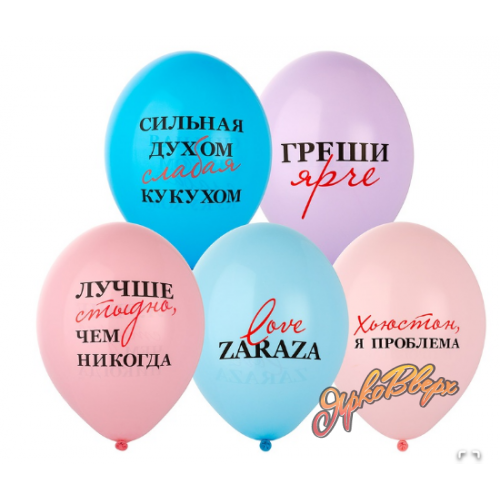 Высококачественный шар из натурального латекса. Ассорти из пяти цветов, одного типа - пастель - матовый оттенок цвета. Шары с двусторонним шелкографическими рисунком - надписями: Love ZARAZA; Лучше стыдно, чем никогда; Греши ярче; Хьюстон, я проблема; Сильная духом, слабая кукухом. Идеальный ассортимент для розничной продажи воздушных шариков и украшения праздника.