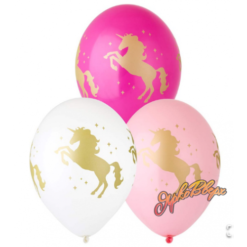 Качественные круглые латексные шары размером 14 дюймов (32-34 см в надуве) В упаковке: 25 штук. Для надува можно использовать как воздух, так и гелий. Высококачественный шар из натурального латекса. Пастель. Шары с четырехсторонним - круговая печать, шелкографическим рисунком золотой Единорог. Предназначен для розничной продажи воздушных шариков. Ассорти шаров из белых, светло и темно розовых цветов.