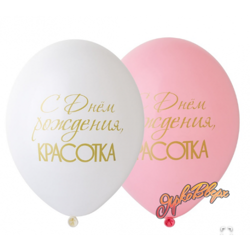 Круглые латексные шары размером 14 дюймов (32-34 см в надуве) В упаковке: 50 штук. Для надува можно использовать как воздух, так и гелий. Высококачественный шар из натурального латекса. Ассорти из двух цветов (розовый и белый), одного типа - пастель - матовый оттенок цвета. Шары с двусторонним шелкографическим рисунком-надписью С Днем Рождения, Красотка. Золотой принт с большим полем печати. Идеальный ассортимент для розничной продажи воздушных шариков и украшения праздника