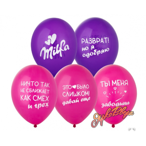 В упаковке 50 штук. Высококачественный шар из натурального латекса. Шары пастель - матовый оттенок цвета, с двусторонним шелкографическим текстами: Milfa. Разврат, но я одобряю. Ты меня заводишь. Это было слишком, давай еще. Ничто так не сближает, как смех и грех. . Идеальный ассортимент для розничной продажи воздушных шариков и украшения праздника.