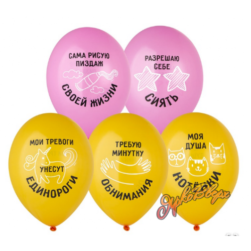 В упаковке 50 штук . В нежных оттенках розового и медово-желтого, эти шары украшены уникальными двусторонними шелкографическими принтами, специально подобранными для прекрасных дам. Каждая надпись несет в себе особое послание: "Разрешаю себе сиять" – призыв к внутренней уверенности и яркости. "Мои тревоги унесут Единороги" – сказочное пожелание легкости и избавления от забот. "Требую минутку обнимания" – милое напоминание о важности нежности и близости. "Сама рисую пиздаж своей жизни" – смелое заявление о контроле над своей судьбой. "Моя душа Котенки" – очаровательное признание в своей мягкости и игривости. Эти шары станут идеальным дополнением к любому торжеству, будь то день рождения, девичник или просто способ поднять настроение.