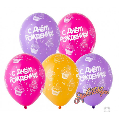 В упаковке 25 штук. Высококачественный шар из натурального латекса. Одного типа - пастель. Шары с пятисторонним - круговая печать, шелкографическим рисунком С Днем Рождения. Кексы. Предназначен для розничной продажи воздушных шариков. Ассорти шаров ярких цветов.